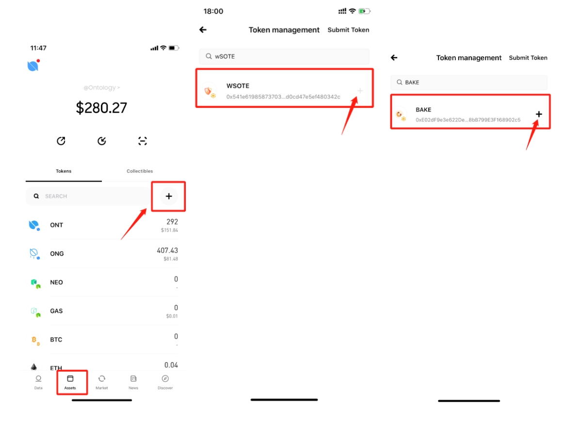 Search and add wSOTE and CAKE tokens in the ONTO asset page.