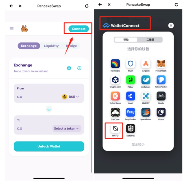 PancakeSwap dApp will default to the BEP-20 BNB address on ONTO. If you find that the wallet is not connected, click “connect wallet” and select a wallet option to connect according to your preference.