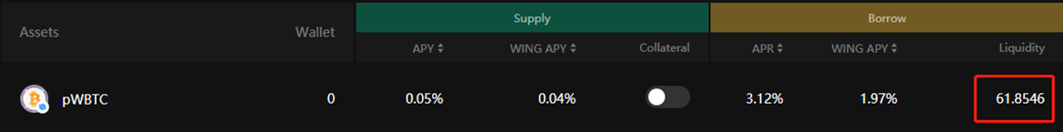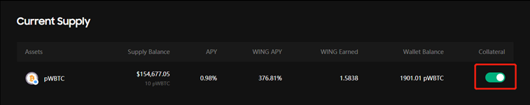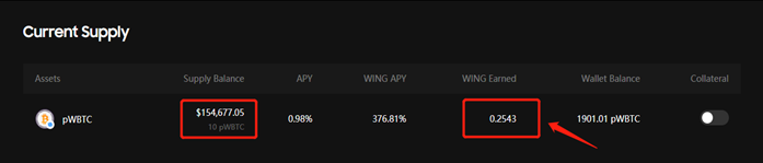 When you have successfully supplied your pWBTC, you can check the amount in the “Currently Supplied” list. And you can find the WING incentives you received for completing the supplying of pWBTC.