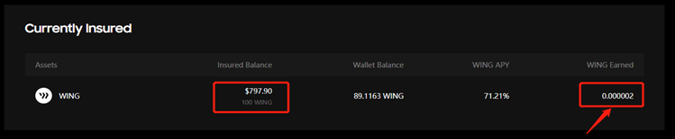 Upon completion, the total amount of WING you insured will be displayed under “Currently Insured”. You can also find the amount of “WING” you earned for insuring the amount WING under “WING Earned”.