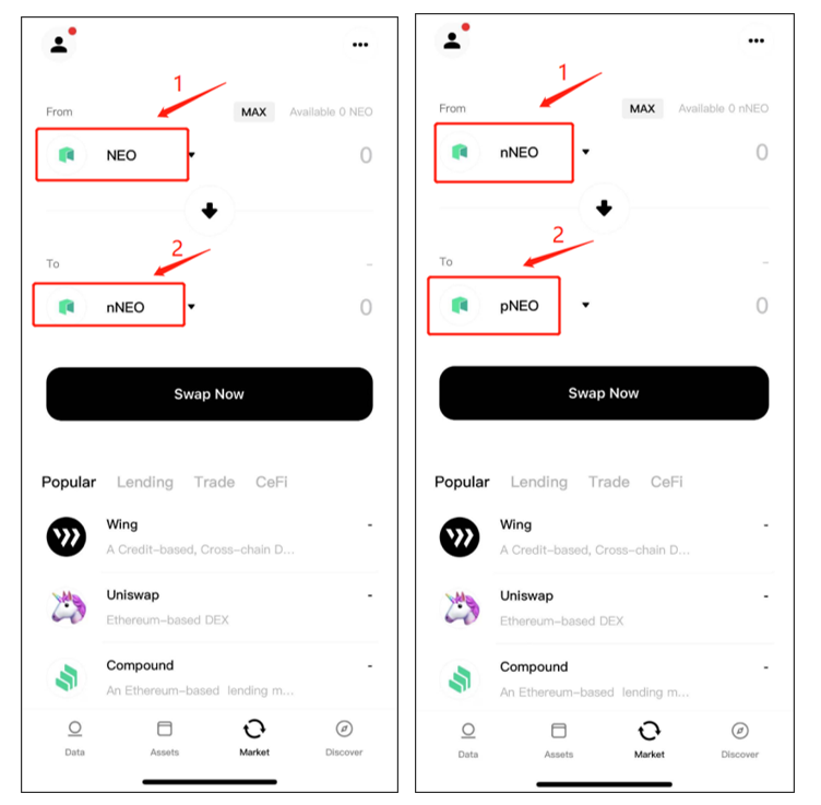 The NEO asset needs to go through 2 steps to be swapped to pNEO. NEO will first be swapped to nNEO in the “Market” page, and nNEO will then be swapped into pNEO, with both steps costing GAS fees. See above for swapping and reverse swapping guides.