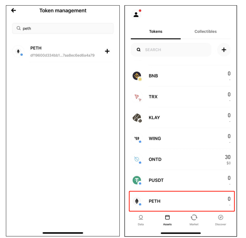 Input the asset or the Hash of the asset you want to add to your asset list. Click the “+” on the right of the asset to complete the addition. You can check the newly added asset at the “Assets” page. The pToken balance is shown on the right.