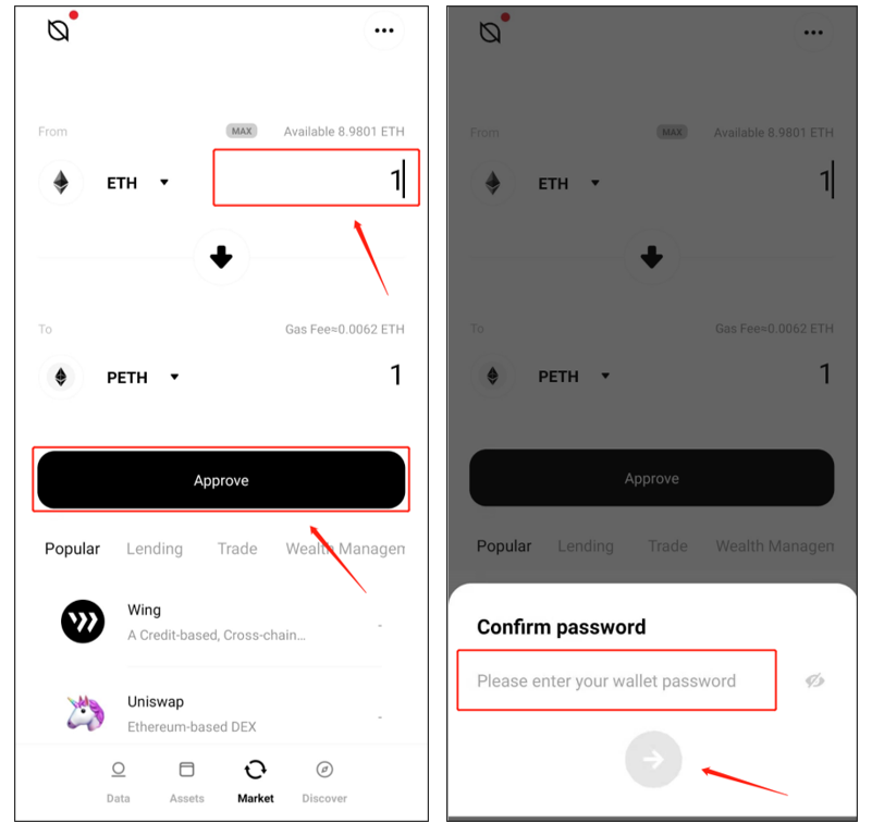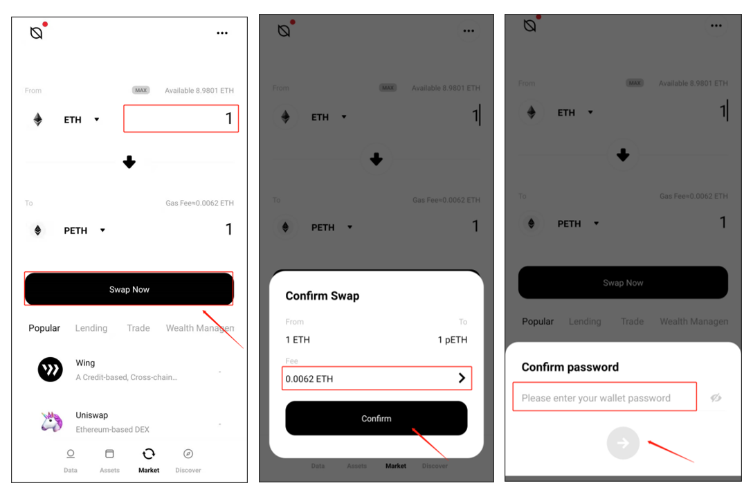 After you’ve completed the authorization, go to the “Market” page and input the number of ETH you want to swap. The number of pETH and the fee (calculated in ETH) will automatically be displayed on the page (Note that the fees of all cross-chain swaps between Ethereum and Ontology are calculated in ETH). Click “Swap Now” to confirm the swap in the popup window, input your wallet password in the popup window and click “Swap Now” again to complete the swap. You can check the pETH you have swapped in the “Assets” page after the swap is completed.