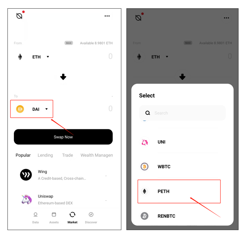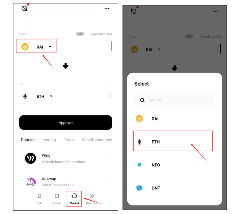 Open your ONTO wallet, then click “Market” on the lower part of the page to enter the cross-chain swap page. Choose the token into which you wish to swap your Ethereum assets. For the purpose of this guide, we are swapping ETH to pETH. Click the asset icon under the “From” field, and choose ETH in the popup list.