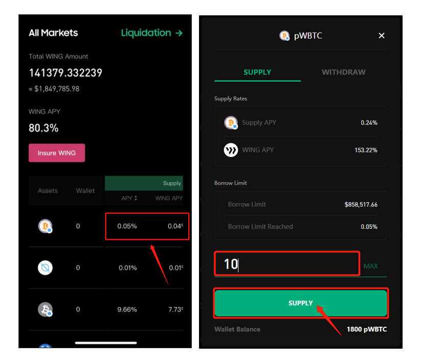 For the purpose of explanation, we are using pWBTC as an example. Click the “Supply” area in the line of pWBTC, and input the amount of pWBTC desired for supplying. Alternatively, you can click “MAX” on the right of the input field to have all your pWBTC supplied. Click the “Supply” button, confirm the supplying information and click the arrow button to input your wallet password.