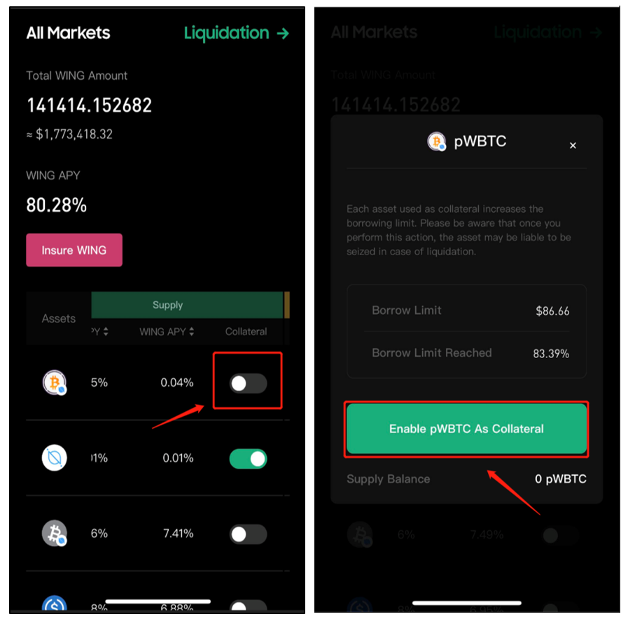 As shown in the picture above, pWBTC can now be used as collateral, and the 10 pWBTC we deposited just now can be used as collateral to borrow other assets.