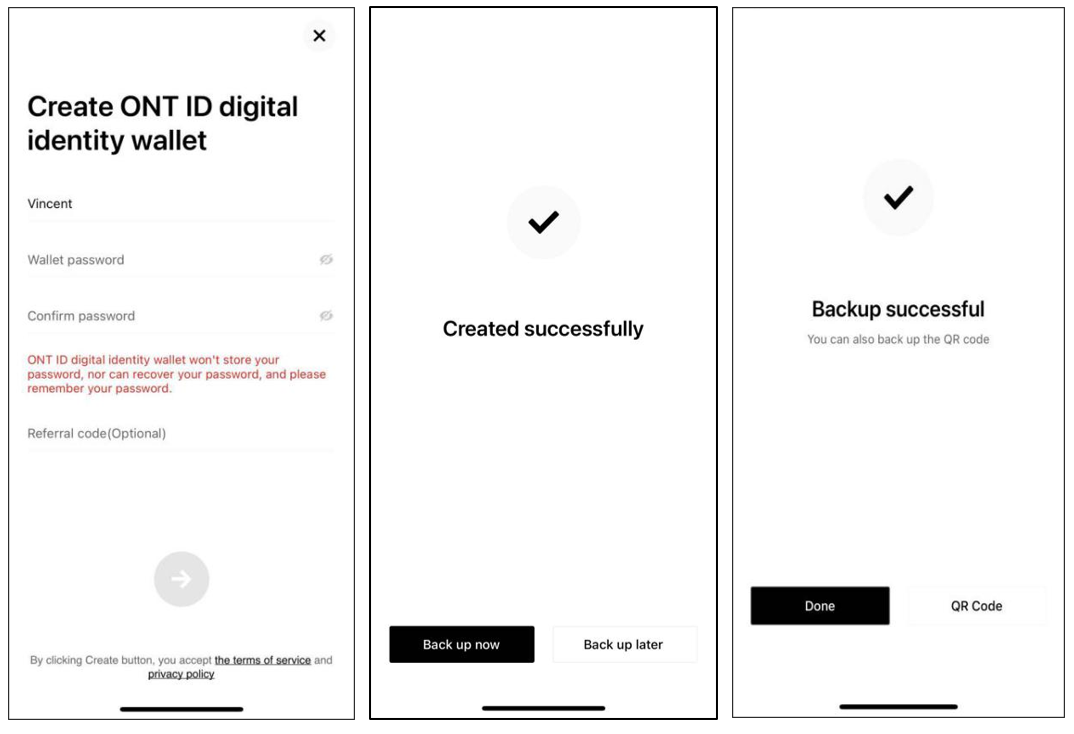 First-time users need to create their ONT ID. Open ONTO, create your ONT ID and click “Back up now” to back up your mnemonic phrase. You have created your ONT ID if the page says “Backup successful”. Users who have an ONT ID can import their ONT ID to the wallet through the mnemonic phrase.