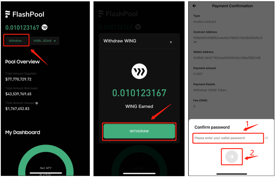 Go to the Flash Pool page, and the number displayed alongside the WING icon in the upper-left corner indicates the WING tokens you’ve earned as incentives. Click “Withdraw” and confirm the information. Next, click the arrow button within ONTO and input your wallet password before clicking the arrow button again to confirm. Once completed, the WING incentives can be withdrawn to your ONTO Wallet.
