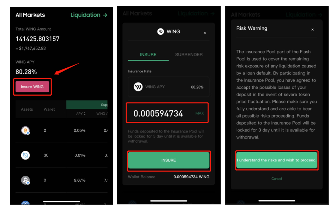 An address can only insure Wing in the Flash Pool if the address isn’t supplying or borrowing WING in Flash Pool. That is to say, if you have used one address to supply or borrow WING in the Flash Pool, you can no longer insure WING.