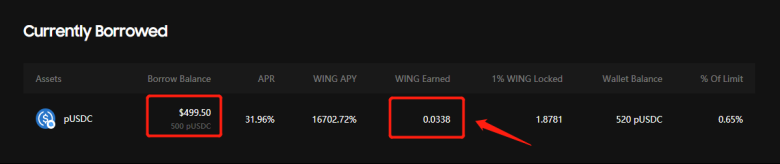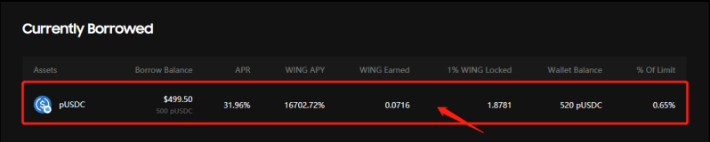 When the borrowing is complete, you can check the amount of pUSDC you borrowed under “Currently Borrowed”. You can also find the amount of “WING” you earned for borrowing ONTd under “WING Earned”.