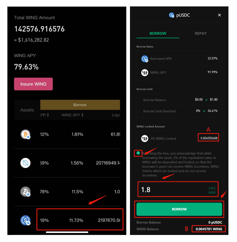 If you want to earn WING incentives through borrowing in the Flash Pool, you need to transfer enough WING to your address before borrowing. Tick the box to lock 3% of WING tokens in your address in the popup window. The number of WING locked will automatically display at the A spot in the picture above, and the WING balance of the address will show at the B spot. Only when A≤B will the lock considered complete. If you do not tick the box to agree locking 3% of WING tokens in your address, you will not earn WING incentives through borrowing assets in the Flash Pool. Next, click “Borrow” to confirm the information & input your wallet password before clicking the arrow button again to confirm. Once you’ve completed the steps, you will have borrowed assets into your address.